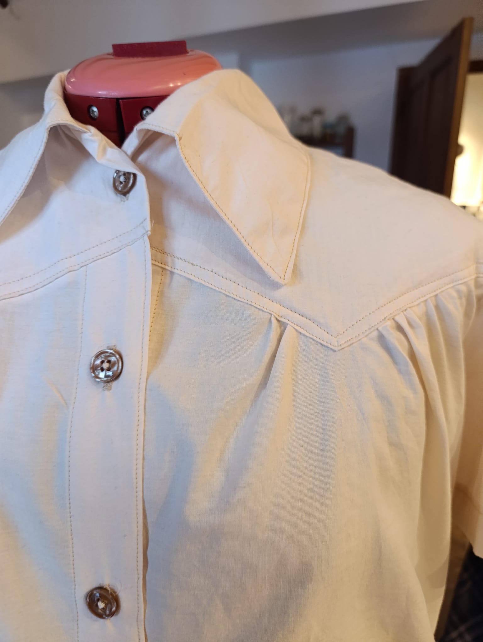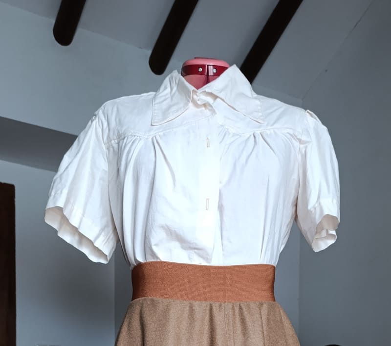 Deze blouse is gebaseerd op jaren 40 stijl en heeft een leuk accent in het voorpand. De blouse is perfect om op een rijrok te dragen, vooral om bijvoorbeeld een Working Equitation outfit compleet te maken, voor onder een rij-jasje bijvoorbeeld. Bovendien is de blouse lekker luchtig door de korte mouwen. Standaard wordt de blouse gemaakt van een luchtige katoen met effen plastic knoopjes. In overleg kunnen er andere knoopjes gekozen worden, bijvoorbeeld in barokke stijl. De blouses worden in standaard maten gemaakt, ik bepaal de juiste maat aan de hand van jouw taille en bustemaat. Wil je een wat ruimere of juist nauwer sluitende blouse, geef dit dan aan bij bestellen.