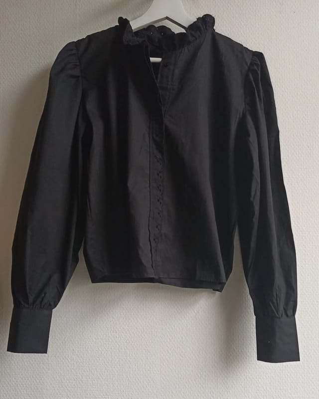 Het model op de laatste foto is een model met opstaand broderie kanten kraagje in plaats van puntkraag, een subtiele pofmouw en blinde knoopjes (afgedekt door een broderie schulprandje) in zwart katoen