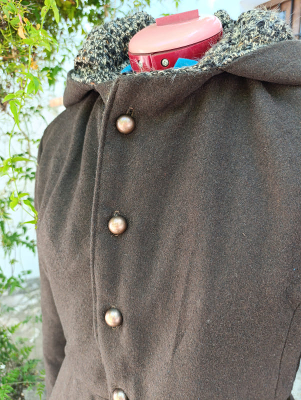 De modellen op de foto's zijn gemaakt met bruin-melange wollen mantelstof en een bruine ruiten wollen mantelstof (maat XS) en een versie met bruin-melange wollen mantelstof en donkerbruine wolblend (maat M)