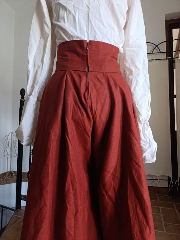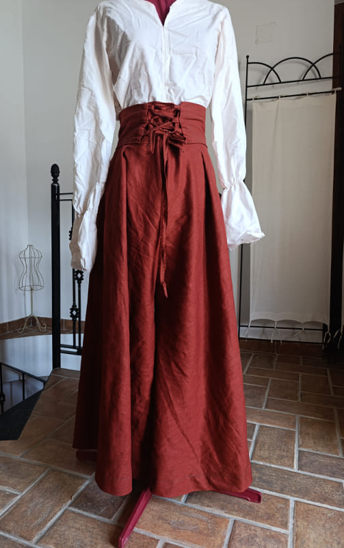 De Flow broek is voorzien van een rits in de tailleband op de rug en een rijgsluiting voorop de buik om de broek comfortabel aan te passen aan je taille.Deze broek kan gemaakt in linnen en flanel. Het model op de foto is roestkleurig linnen.